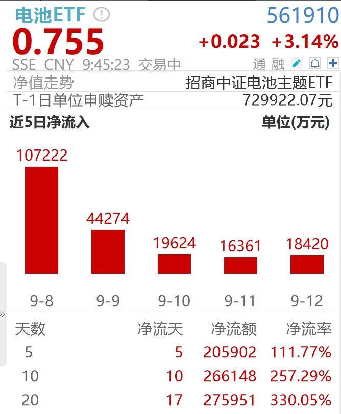 最近10个交易日,电池ETF(561910)持续获得净流入,短短10天“吸金”超过26.6亿,非常强悍。