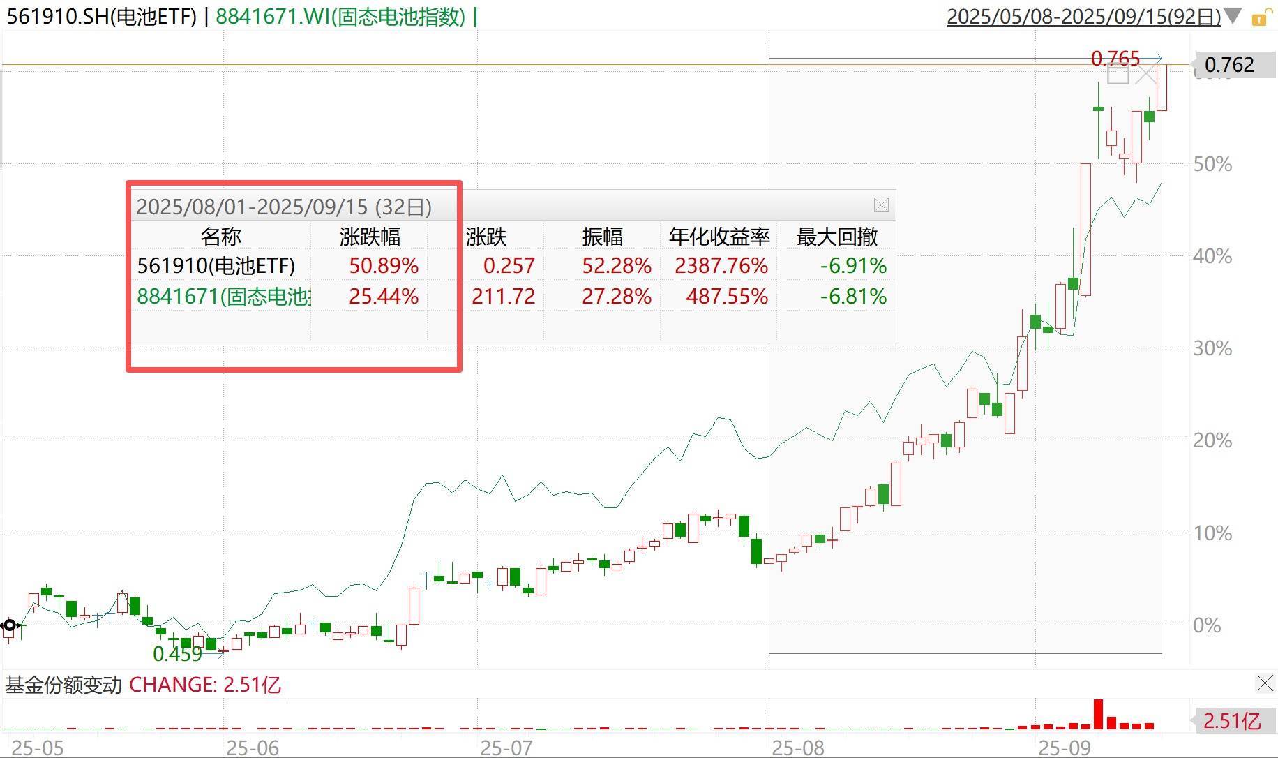 重仓宁德时代等龙头电池厂商的电池ETF(561910)早盘也创了净值新高、盘中一度涨超4%。从过往表现来看,这个ETF八月以来涨幅已经超过50%,大幅跑赢固态电池指数25个百分点,可谓是一鸣惊人。