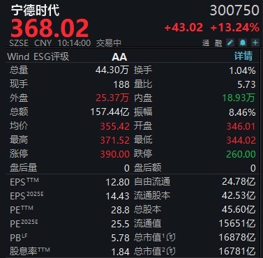 【大河财立方消息】9月15日,宁德时代A股盘中涨幅达14%,报371元/股,创历史新高宝龙配资,截至发稿报368.02元/股,涨13.24%,市值逼近1.7万亿;宁德时代港股同步上涨,盘中涨近10%,股价创上市以来新高。