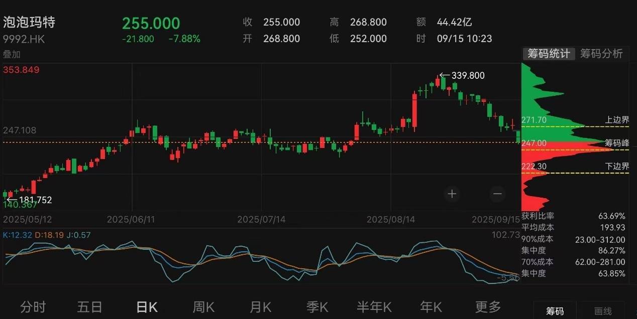 港股早盘,泡泡玛特(9992.HK)低开低走股涨柜,盘中一度跌超8%,创一周来最大盘中跌幅。截至发稿股涨柜,泡泡玛特下跌7.88%,报255港元。